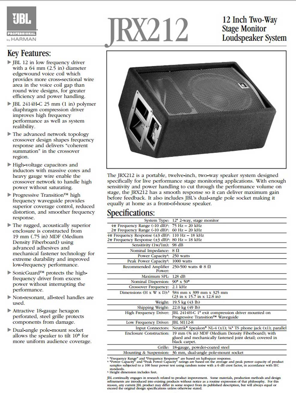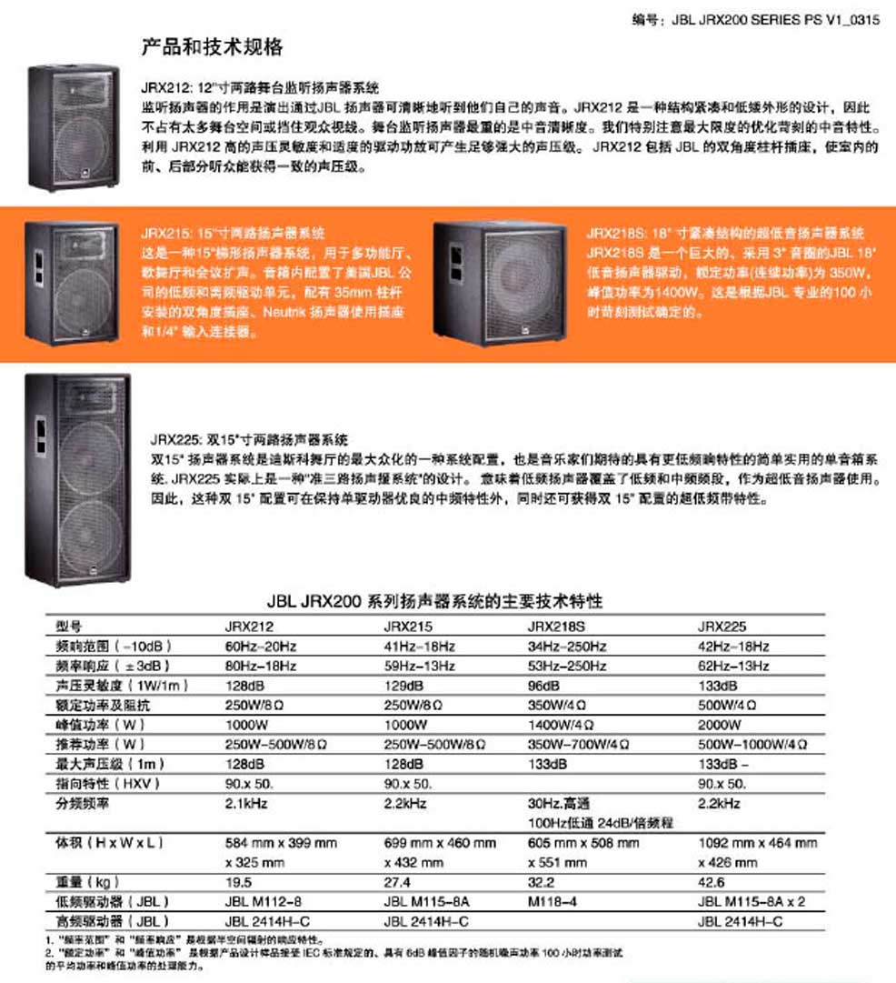 JBL JRX215 舞臺會議室多功能廳音箱 專業(yè)音響設(shè)備 15寸無源音響 專業(yè)揚聲器 會議培訓(xùn)演出音響系統(tǒng)工程 擴聲系統(tǒng)。JRX215:15" 兩路揚聲器系統(tǒng) JRX215 和JRX212 固定安裝揚聲器JRX215 和JRX212 是便攜式JRX200 揚聲器系列中的兩個型號產(chǎn)品。兩者都是為懸吊安裝設(shè)計的,不適合作疊積和柱桿安裝,因為手柄、腳和柱桿安裝插座都已拆除。3 個內(nèi)部的金屬螺栓,吊繩穿到附加的M10眼圈螺栓中。在完整的包裝中,提供3 個鍛造眼圈螺栓。其他全部特性與相對應(yīng)的便攜式揚聲器相同。