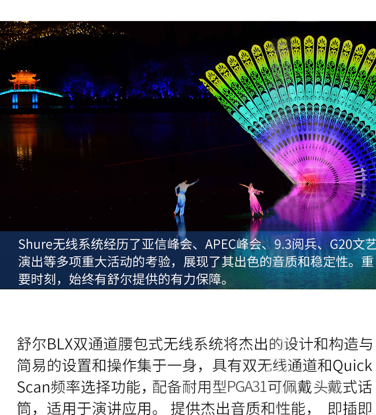 舒爾BLX無(wú)線系統(tǒng)不僅能夠提供專業(yè)品質(zhì)的音效,并且安裝簡(jiǎn)易,界面直觀,即插即用,品質(zhì)優(yōu)異。其設(shè)計(jì)精密,有手持式、領(lǐng)夾式、樂(lè)器和頭戴式等多種配置可選,是舞臺(tái)上的絕佳之選。BLX標(biāo)準(zhǔn)版配備帶PG話筒頭的單通道和雙通道系統(tǒng)。