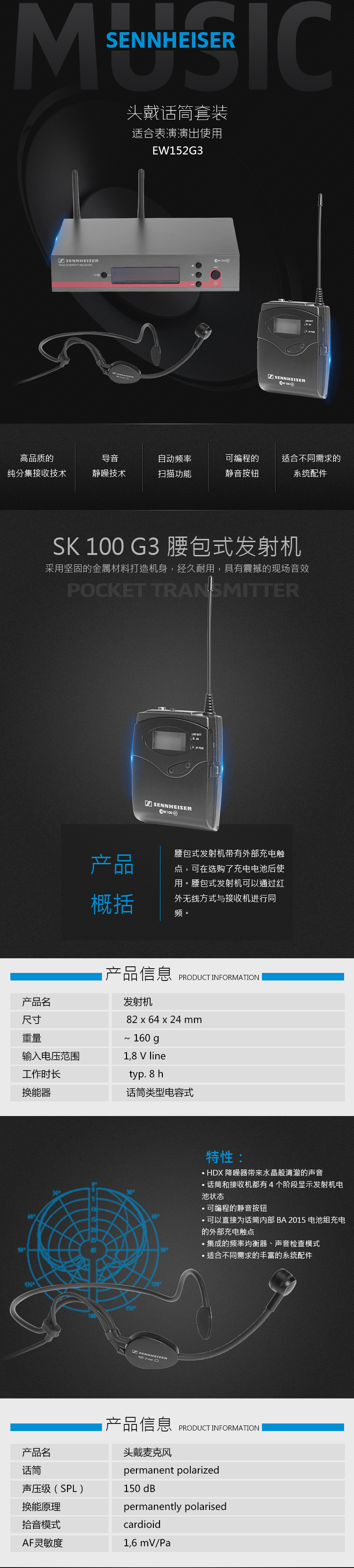 騰出雙手,表現自我:你可以在整個舞臺上專注表演而無須手持話筒。套裝內的心形電容式頭戴話筒很容易佩戴,有出色的爆音防護并且傳遞強勁的聲音。另外套裝內包含了通過舞臺考驗的純分集接收機和腰包式發射機,它具有外部充電觸點,可為選購的BA2015 充電電池組直接充電。 特點 堅固的金屬外殼 42 MHz 的切換頻寬,1680個可調諧的UHF頻率帶給你無干擾的接收 增強的頻率組系統,每組最多12個兼容頻率 高品質的純分集接收技術 導音靜噪技術可以在發射機關閉時去除無線射頻干擾 自動頻率掃描功能可以自動尋找可用頻率 增強的音頻頻率范圍 利用紅外線界面與無線發射機同頻 具有更多可控選項的用戶友好的菜單操作 有背光照明的圖形化顯示屏 可以避免意外改變設置的自動鎖定功能 HDX降噪器帶來水晶般清澈的聲音 話筒和接收機都有4個階段顯示發射機電池狀態 可編程的靜音按鈕 可以直接為話筒內部BA 2015電池組充電的外部充電觸點 集成的頻率均衡器、聲音檢查模式 適合不同需求的豐富的系統配件。